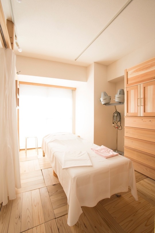針葉樹の無垢材を使用した明るい施術ルームは、約4畳の広さでゆったりとお過ごしいただけます。余計な装飾を省き、自然光を取り入れた空間で心身ともにリラックスできる環境を整えました。また、お灸は煙の出ない電子温ねつ灸を採用し、快適に施術を受けていただけます。