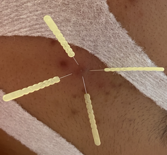 化膿したニキビには、写真のように周囲から鍼を刺すことで、中身の排出がスムーズに進みます。