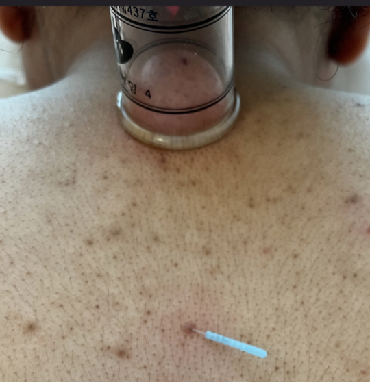 背中の経穴に鍼とカッピング